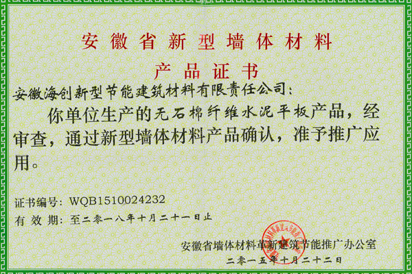 ? ? 為打造海螺板業(yè)品牌形象,增強品牌影響力,經(jīng)過近半年的準(zhǔn)備和實施,先后歷經(jīng)省市兩級專家組現(xiàn)場調(diào)研、工藝資料審查、現(xiàn)場實物檢測,以及安徽省革新建筑節(jié)能推廣辦公室專家組會議復(fù)核評審論證等程序,安徽海創(chuàng)新材料公司所生產(chǎn)的無石棉纖維水泥平板產(chǎn)品終獲省新型墻體材料認(rèn)證,并取得新型墻體材料產(chǎn)品認(rèn)證證書。
