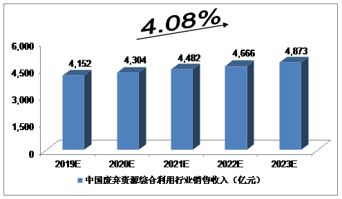 ? ? 我們預(yù)計(jì),2019年我國(guó)廢棄資源綜合利用行業(yè)銷售收入將達(dá)到4,152億元,未來五年(2019-2023)年均復(fù)合增長(zhǎng)率約為4.08%,2023年將達(dá)到4,873億元。