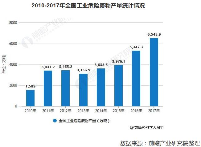 ? ? 近年來,隨著我國經(jīng)濟(jì)總量不斷擴大,工業(yè)危險廢物產(chǎn)量也出現(xiàn)明顯增加。2010年全國工業(yè)危險廢物產(chǎn)量已達(dá)1589萬噸,2012年全國工業(yè)危險廢物產(chǎn)量增長至3465.2萬噸,2013年有所下降,之后繼續(xù)增長,到了2016年全國工業(yè)危險廢物產(chǎn)量達(dá)到5347.3萬噸,較上年同比增長34.49%。截止到2017年全國工業(yè)危險廢物產(chǎn)量達(dá)到突破6500萬噸。但有效處理量不足,危險廢物處理水平有待提高。