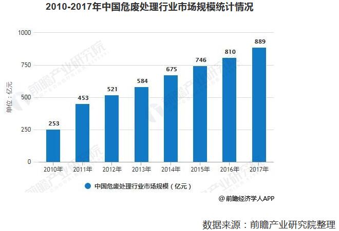 ? ? 我國危廢處理行業(yè)自2001年左右起步,經(jīng)過十多年的發(fā)展,行業(yè)進(jìn)入快速增長階段,但也存在經(jīng)驗和技術(shù)上的短板。由于我國危廢整體處置率較低,使得行業(yè)市場規(guī)模較小。據(jù)前瞻產(chǎn)業(yè)研究院發(fā)布的《中國危廢處理行業(yè)市場前瞻與投資戰(zhàn)略規(guī)劃分析報告》統(tǒng)計數(shù)據(jù)顯示,2010年中國危廢處理行業(yè)市場規(guī)模僅僅為253億元,2011年中國危廢處理行業(yè)市場規(guī)模增長至453億元。之后一直保持平穩(wěn)增長,到了2016年中國危廢處理行業(yè)市場規(guī)模突破800億元,截止到2017年中國危廢處理行業(yè)市場規(guī)模達(dá)到了約889億元。