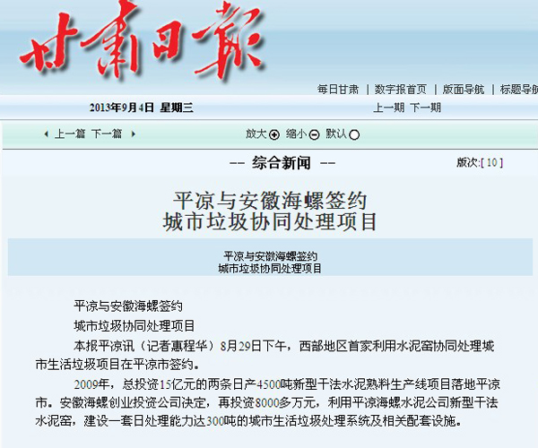 ??? 2009年,總投資15億元的兩條日產(chǎn)4500噸新型干法水泥熟料生產(chǎn)線項(xiàng)目落地平?jīng)鍪?。安徽海螺?chuàng)業(yè)投資公司決定,再投資8000多萬元,利用平?jīng)龊B菟喙拘滦透煞ㄋ喔G,建設(shè)一套日處理能力達(dá)300噸的城市生活垃圾處理系統(tǒng)及相關(guān)配套設(shè)施。