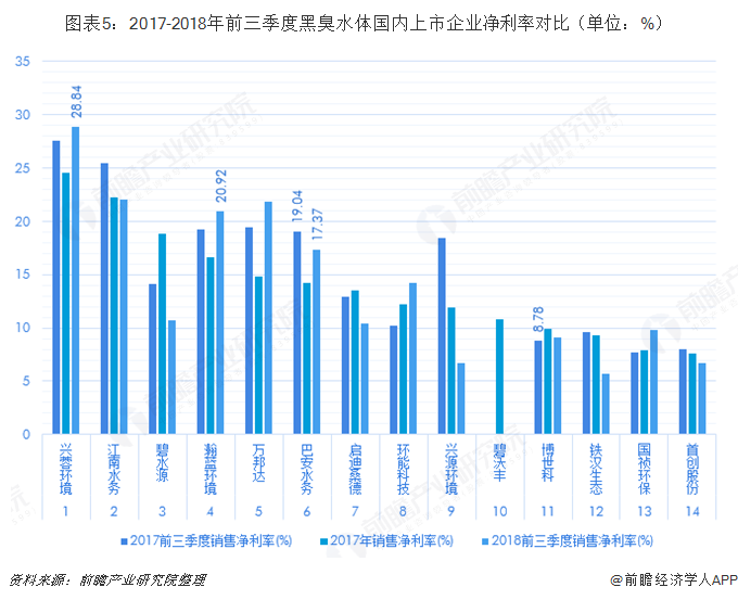 ? ? 具體來看,2018前三季度,啟迪桑德的凈利潤為8.85億元,同比增長5.4%;排在第二和第三位的興蓉環(huán)境和瀚藍(lán)環(huán)境的凈利潤分別較上年同期上漲了15.4%和27.6%。凈利潤增速最快的企業(yè)為國禎環(huán)保(121.8%)和博世科(113.6%);興源環(huán)境的凈利潤同比下滑了70.3%。
