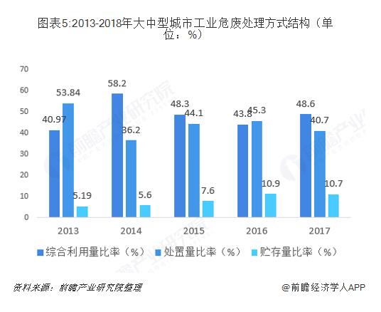 ? ? 從處理方式來(lái)看,綜合利用逐漸成為大中型工業(yè)危廢的主要處理方式,工業(yè)危廢綜合利用量比例由2013年的40.97%上升至2017年的48.6%;處置量比例由2013年的53.84%下降至2017年的40.7%。
