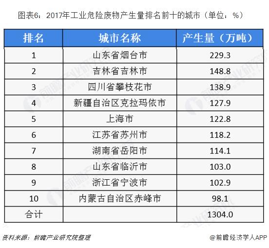 ? ? 從地區(qū)上來(lái)看,2017年工業(yè)危廢排名前十的城市共計(jì)產(chǎn)生工業(yè)危廢1304萬(wàn)噸,占全部信息發(fā)布城市產(chǎn)生總量的32.5%。排名前三的分別為山東省煙臺(tái)市、吉林省吉林市和四川省攀枝花市,產(chǎn)生量分別為229.3萬(wàn)噸、148.8和138.9萬(wàn)噸。與一般工業(yè)固廢不同的是,山東省工業(yè)危廢產(chǎn)生量較多,在前十城市中占據(jù)兩席;西部地區(qū)入榜反而較少,主要原因?yàn)槲鞑抗I(yè)以一般工業(yè)為主,沿海地區(qū)工業(yè)結(jié)構(gòu)偏向高端制造。