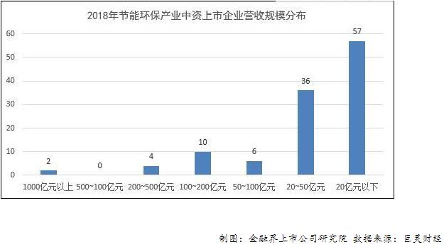 ? ? 在對截至4月30日已披露2018年營收數(shù)據(jù)的節(jié)能環(huán)保產(chǎn)業(yè)中資上市企業(yè)不同營收規(guī)模的企業(yè)數(shù)量情況進(jìn)行分析的過程中,報告發(fā)現(xiàn),在節(jié)能環(huán)保產(chǎn)業(yè)中資上市企業(yè)中,營收規(guī)模在1000億元以上的有2家,營收規(guī)模在500億元~1000億元之間的企業(yè)數(shù)量為0,多數(shù)企業(yè)營收規(guī)模都在50億元以下。說明我國節(jié)能環(huán)保產(chǎn)業(yè)企業(yè)業(yè)務(wù)規(guī)模普遍較小,行業(yè)集中度不高。