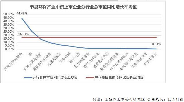 ? ? 節(jié)能環(huán)保產(chǎn)業(yè)與其他行業(yè)的交叉性比較強,細(xì)分行業(yè)眾多。報告對截至4月30日總市值同比增長率排名前15的細(xì)分行業(yè)總市值同比增長率均值情況進(jìn)行分析,發(fā)現(xiàn)在GICS4級行業(yè)分類下,環(huán)境與設(shè)施服務(wù)行業(yè)總市值同比增長率均值最高,遠(yuǎn)超產(chǎn)業(yè)整體。主要是在環(huán)保治理壓力下,環(huán)保相關(guān)行業(yè)發(fā)展前景更被看好。