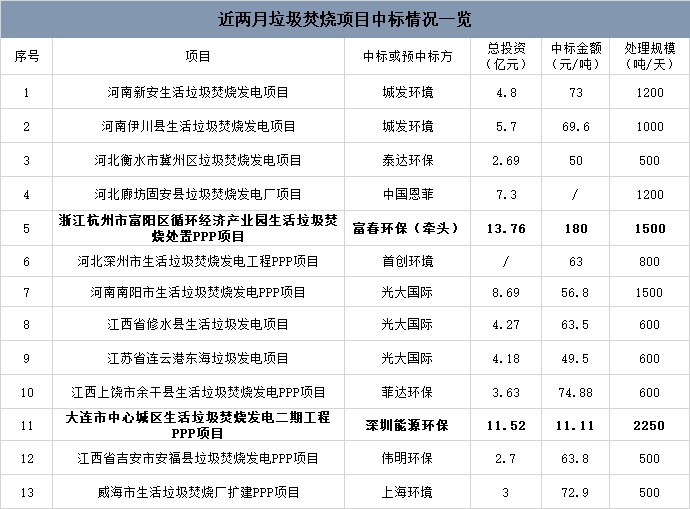 ? ? 第四,這兩月,出現(xiàn)了兩起比較特別的垃圾焚燒項目,一起是浙江杭州市富陽區(qū)循環(huán)經(jīng)濟產(chǎn)業(yè)園生活垃圾焚燒處置PPP項目,該項目以180元/噸的中標價成為截止目前的年度最高中標價,另一起是大連市中心城區(qū)生活垃圾焚燒發(fā)電二期工程PPP項目,該項目最終花落深圳能源環(huán)保,中標價刷新歷史最低記錄,去到11.11元/噸。項目詳情可點擊附錄查看。