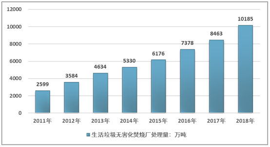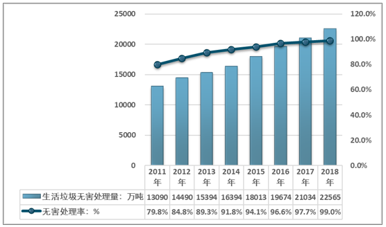? ? 最巨大的環(huán)保需求拉動(dòng)下,國(guó)內(nèi)生活垃圾處理行業(yè)出現(xiàn)同步增長(zhǎng)。較2011年全國(guó)79.8%的無(wú)害處理率,中國(guó)生活垃圾無(wú)害處理行業(yè)取得令人矚目的成績(jī)。2018年全國(guó)生活垃圾無(wú)害處理量達(dá)到22565萬(wàn)噸,無(wú)害處理率達(dá)到99%。