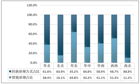 ? ? 從區(qū)域情況看,各地區(qū)焚燒處理方式利用情況差異性較大。經(jīng)濟(jì)發(fā)達(dá)地區(qū)采用焚燒處理方式比率較高,其中華東為64.8%,西南51.3%,華南41.1%,而西北、東北地區(qū)焚燒方式利用率較低。