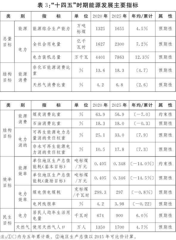 結(jié)構(gòu)目標(biāo)。到2025年,力爭非化石能源消費(fèi)比重提高到18.3%,較全國同期增幅高0.6個百分點(diǎn);天然氣消費(fèi)比重提高到6.8%;煤炭消費(fèi)比重降低到56.9%。力爭可再生能源電力總量消納責(zé)任權(quán)重達(dá)到33%,非水可再生能源電力消納權(quán)重達(dá)到17.8%。