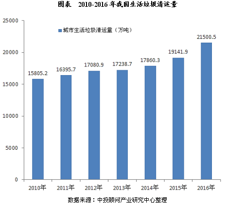? ? 中投顧問發(fā)布的《2018-2022年中國生活垃圾處理行業(yè)深度調(diào)研及投資前景預(yù)測報告》數(shù)據(jù)顯示:2016全國生活垃圾清運量約為21500.5萬噸。