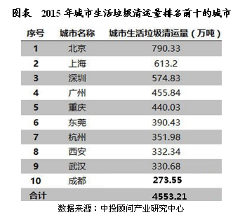 ? ? 在全國661個設(shè)市城市中,生活垃圾清運量前三名的城市分別為北京市、上海市和深圳市,分別為790.33萬噸、613.2萬噸和574.83萬噸。前十名城市的生活垃圾清運量達4553.21萬噸,占全國城市生活垃圾清運量的23.79%。排名前十的城市垃圾清運量見下表。