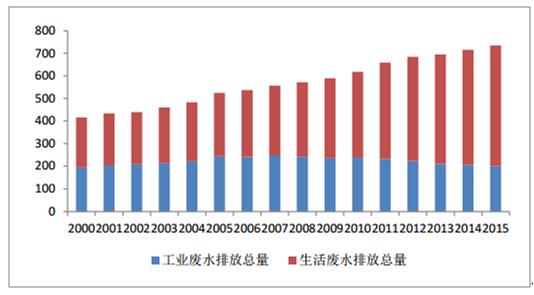 2000-2016年全國廢水排放結構(億噸)