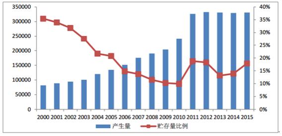 2000-2015年工業(yè)固廢產(chǎn)生量及貯存量比例(萬噸,%)