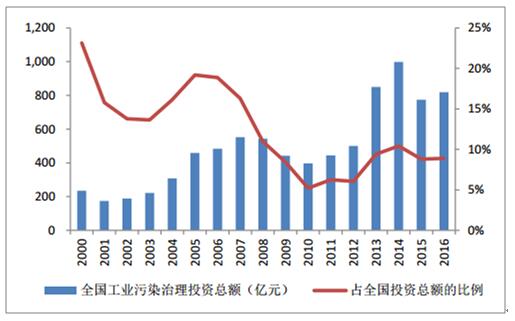 2000-2016年工業(yè)污染治理投資總額及其占比