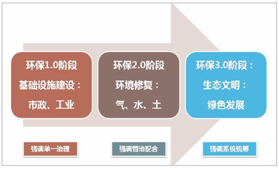 ? ? 根據(jù)環(huán)保行業(yè)發(fā)展歷程可將其大致劃分為三個(gè)階段,環(huán)保1.0階段,本階段伴隨中國(guó)城市化工業(yè)化進(jìn)程,以環(huán)保固定資產(chǎn)投資和基礎(chǔ)設(shè)施建設(shè)為主;環(huán)保2.0階段,則是2013年后,以“三個(gè)十條”為主的環(huán)境修復(fù)工作,強(qiáng)調(diào)監(jiān)管治理相互配合;而環(huán)保3.0階段,也就是“十九大”以后更傾向于將環(huán)保定義為一種綠色的發(fā)展方式:將綠色融入中國(guó)未來發(fā)展,同時(shí)將環(huán)保作為促進(jìn)中國(guó)經(jīng)濟(jì)轉(zhuǎn)型、推動(dòng)產(chǎn)業(yè)升級(jí)的核心力量。