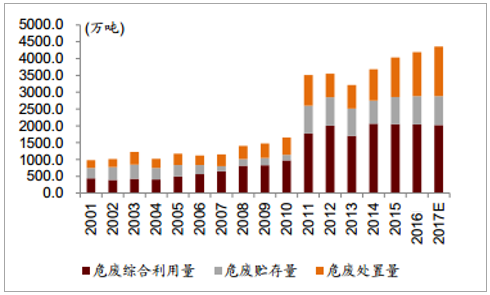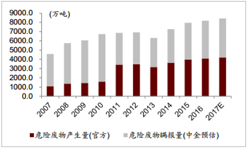 ? ? 危廢生產(chǎn)量逐年上升,從 2011 年的 3,431.2 萬噸上升到 2015 年的 3,976.1 萬噸,復(fù)合增長率約為 3%。但是需要注意的是《統(tǒng)計(jì)公報(bào)》采用的是企業(yè)申報(bào)的方法,因此我們認(rèn)為這個(gè)數(shù)據(jù)遠(yuǎn)遠(yuǎn)低于真實(shí)情況。最直接的對(duì)比就是《第一次全國污染源普查公告》中統(tǒng)計(jì)的 2007 年工業(yè)危廢產(chǎn)生量為4,573.69 萬噸,遠(yuǎn)遠(yuǎn)高于當(dāng)年環(huán)保部公布的 1,079 萬噸。 2011 年,環(huán)保部大幅修改統(tǒng)計(jì)口徑,擴(kuò)大申報(bào)范圍,當(dāng)年《統(tǒng)計(jì)公報(bào)》披露危廢產(chǎn)生量 3,431 萬噸相比 2010 年 1,586萬噸上升一倍有余。即使在這樣的情況下,該數(shù)據(jù)依舊遠(yuǎn)遠(yuǎn)小于《普查公告》數(shù)據(jù)。我們根據(jù)工業(yè)增加值的增長來估計(jì)實(shí)際危廢產(chǎn)生量, 2007 年工業(yè)增加值約為 11.16 萬億。2016 年工業(yè)增加值上升到 24.79 萬億,復(fù)合增長率約為 9.26%。如果考慮到企業(yè)減排和循環(huán)利用的因素,我們適當(dāng)調(diào)低危廢產(chǎn)生增速, 2016 年我們預(yù)期的危廢實(shí)際產(chǎn)生量也達(dá)到了 8100 萬噸。行業(yè)內(nèi)普遍預(yù)期實(shí)際產(chǎn)生量應(yīng)該在 1 億噸/年。