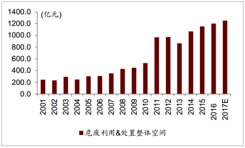? ? 我們?nèi)绻凑漳壳耙延械氖袌龃媪縼碛?jì)算, 然后按照綜合處臵費(fèi)用 1500 元/噸,無害化處臵 3500 元/噸, 貯存填埋 300 元/噸,以及綜合利用單位附加值 2000 元/噸來進(jìn)行總的粗略計(jì)算,則 2017 年我國現(xiàn)有危廢存量空間將達(dá)到 1250 億元以上。 需要注意的是,我們沒有考慮到瞞報(bào)漏報(bào)的數(shù)量,如果考慮進(jìn)約 4000 萬噸每年的官方未統(tǒng)計(jì)數(shù)量, 實(shí)際需求空間將超過 2000 億元。