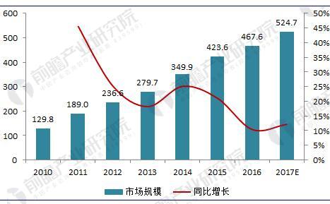 圖表2:2010-2017年我國污泥處理市場規(guī)模變化趨勢圖(單位:億元,%)
