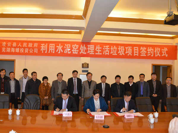 ? ? 2015年3月6日上午,凌云縣人民政府與海螺創(chuàng)業(yè)在凌云縣政府正式簽署了《凌云縣利用水泥窯處理生活垃圾項(xiàng)目合作協(xié)議》,凌云縣縣委書記方立斯,縣長(zhǎng)伍奕蓉,常務(wù)副縣長(zhǎng)游勇滕;海螺創(chuàng)業(yè)總經(jīng)理紀(jì)勤應(yīng)、戰(zhàn)略企劃部常務(wù)副部長(zhǎng)汪俊賢、戰(zhàn)略企劃部副部長(zhǎng)章邦志等參加了簽約儀式。